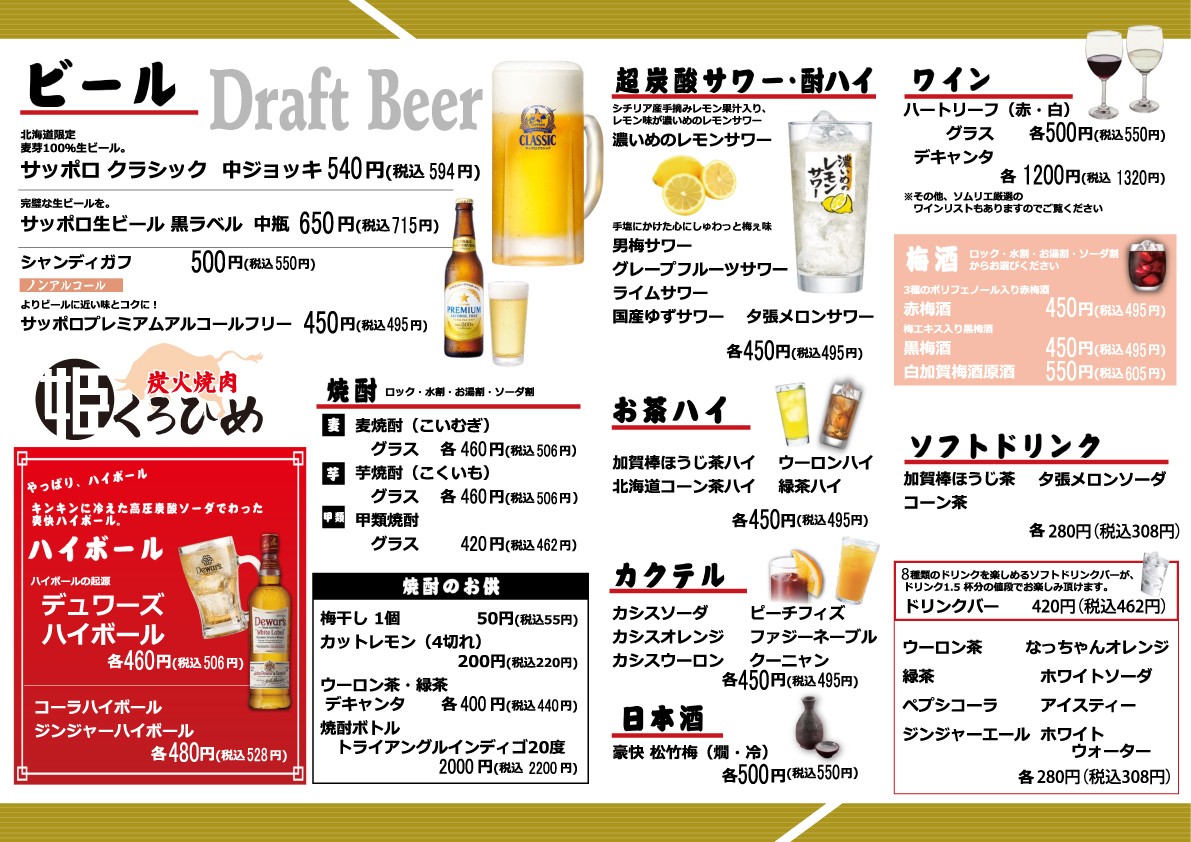 飲物メニュー 焼肉くろひめ|お飲物メニュー 2021年6月18日 焼肉くろひめ 焼肉黒姫 炭火焼肉 札幌 くろひめ 札幌 黒姫 南区 黒姫 南区 くろひめ 和牛 札幌市南区南39条西11丁目2‐8 札幌 焼肉 札幌 炭火焼肉 くろひめ 黒ひめ くろ姫 南区 焼肉 南区 炭火焼肉 南区 ランチ 南区 焼肉ランチ 札幌 焼肉ランチ 札幌 ランチ 南区 焼肉テイクアウト 札幌 焼肉テイクア...